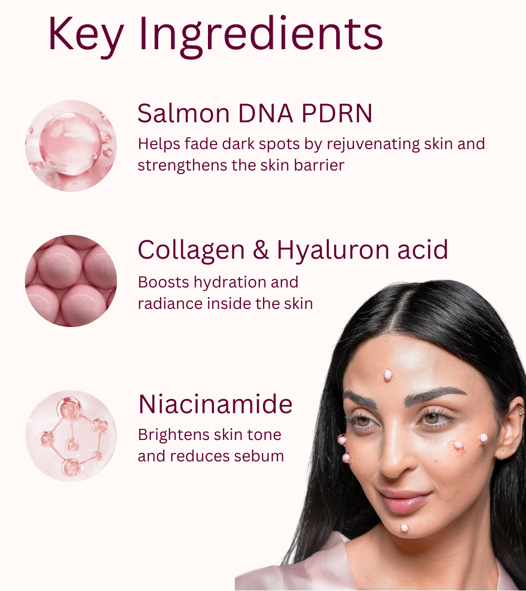 Powered by PDRN (salmon DNA) and enriched with niacinamide, multi-layer hyaluronic acids, peptides, and nourishing botanicals, this silky pink gel-cream restores your skin’s natural glow from the very first use. Each pink capsule is packed with concentrated actives that melt into your skin, delivering deep hydration, collagen support, and accelerated regeneration.